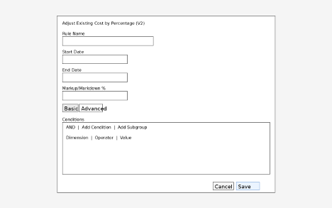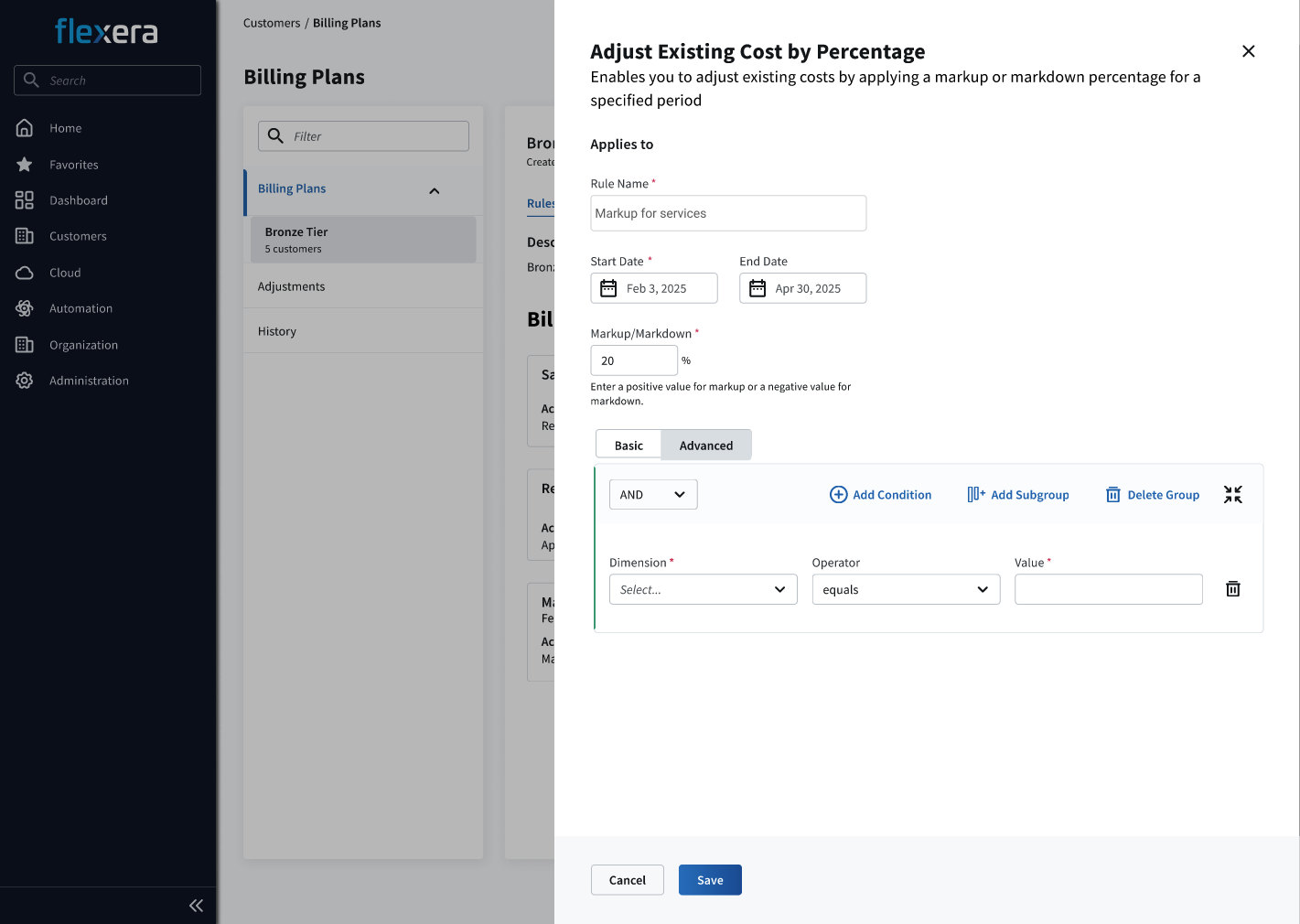 Adds a dedicated modal for “Adjust Existing Cost by Percentage,” including date bounds and a conditions builder (Basic/Advanced) to target providers (AWS, Azure, GCP), services, and regions.