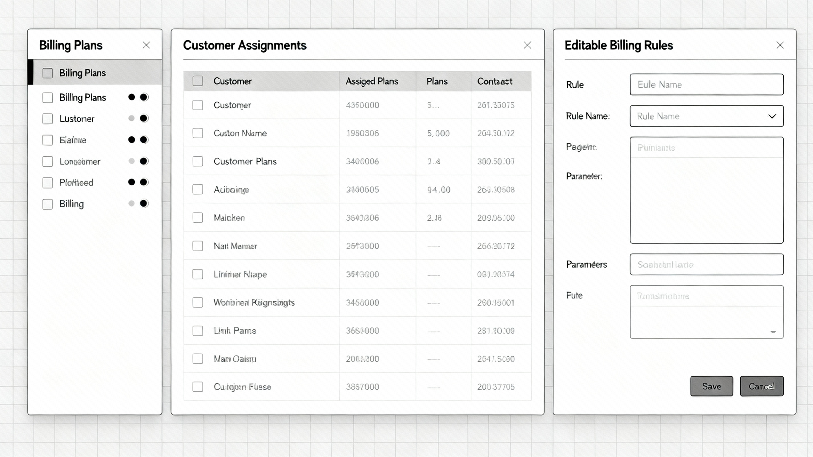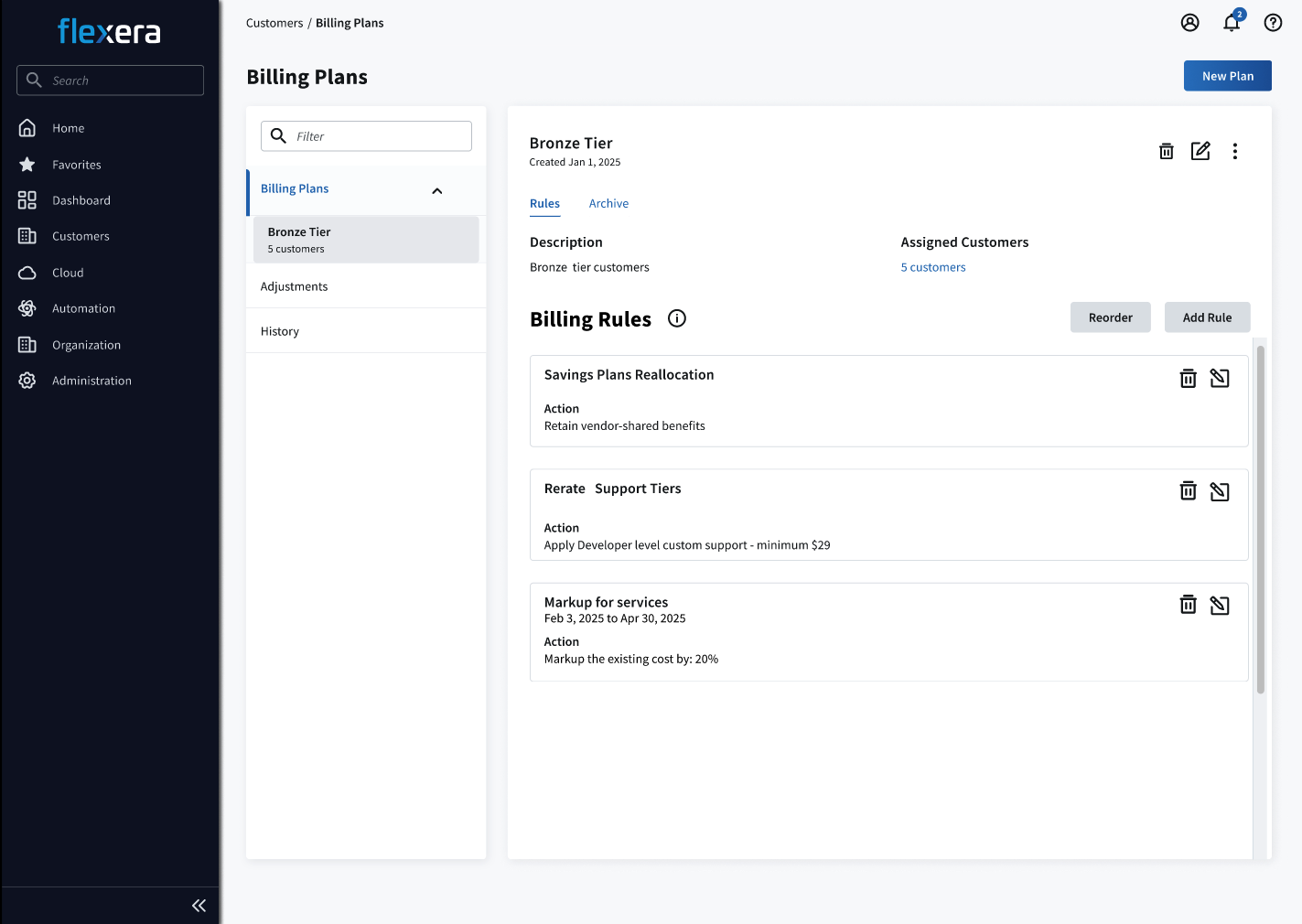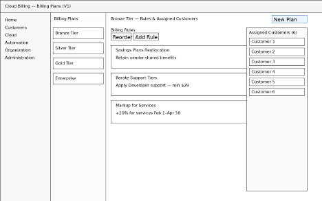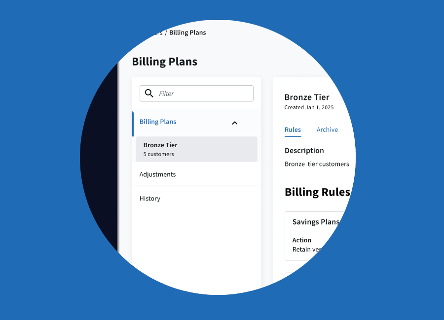 Introduces Billing Plans with a three-pane layout (Nav / Plans / Plan detail). Rules can be added, reordered, and customers are visible within the same view to reinforce the plan-first model.