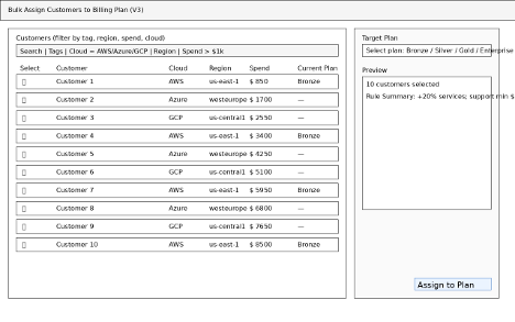 Directly addresses the main pain point by enabling bulk selection and assignment of customers to a single plan, with previews to detect conflicts and communicate resulting charges before applying changes.