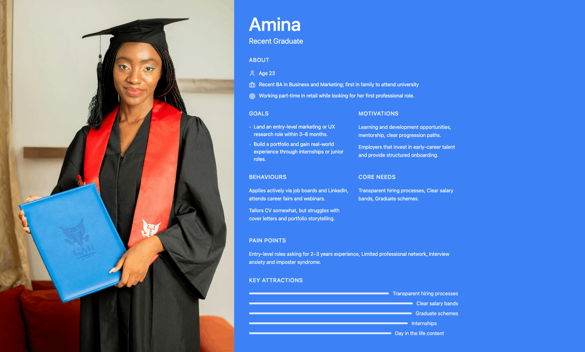 All job applicants are shown their account page with already collected information in their accounts. Addition questions are posed in order to learn more about the user. This data will be used to improve the suggested roles as well as personalise content.